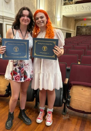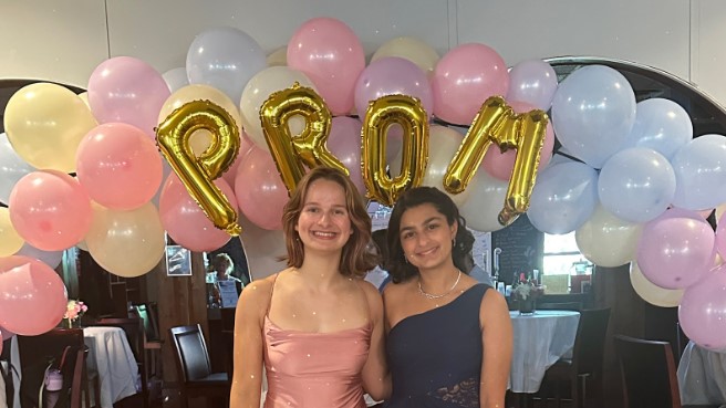 Clara Schulz (izquierda) y Sophia Gandhi (derecha) organizaron un baile de graduación LGBTQ+ en East Brunswick para estudiantes de secundaria de todo Nueva Jersey. (Cortesía de Clara Schulz)
